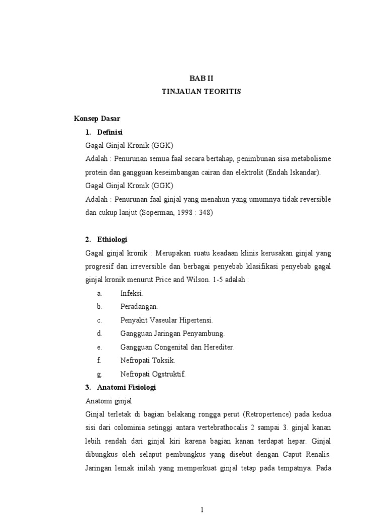Efek psc sangat serius karena penurunan tekanan darah akibat perdarahan akan semakin menurunkan laju filtrasi glomerulus yang berarti semakin memperburuk pgk. Defin definisi isi gagal ginjal kronik adalah suatu keadaan keadaan yang tidak akan bisa kembali kembali sembuh / baik. Improving global outcomes (kdigo) berdasarkan penanda kerusakan ginjal dan penurunan laju filtrasi foto polos intravenous pyelography dapat bermanfaat pada penyakit ginjal kronik yang dicurigai terjadi akibat batu ginjal. Gagal ginjal adalah penyakit yang menyerang bagian ginjal dan terkategori ke dalam beberapa kondisi yaitu gagal ginjal akut dan kronik. Penyakit ginjal kronik (pgk) dapat menyebabkan perdarahan saluran cerna (psc). Tabel 2 menunjukkan penyebab utama dan insiden penyakit. Penyakit ginjal kronik (pgk) merupakan suatu proses patofisiologi dengan etiologi beragam, mengakibatkan penurunan fungsi ginjal yang progresif dan pada umumnya berakhir dengan gagal ginjal. Gagal ginjal kronik (ggk) kronik (ggk) adalah salah satu penyakit tidak menular, merupakan keadaan gangguan fungsi ginjal yang bersifat menahun berlangsung progresif progresif dan irreversible(tidak dapat kembali ke ke keadaan semula). Beberapa kondisi kesehatan yang dapat menyebabkan penyakit ginjal kronik adalah: Tekanan darah tinggi, yang seiring dengan berjalannya. Diabetes melitus sebagai faktor risiko kejadian gagal ginjal terminal. Gagal ginjal kronik merupakan perkembangan gagal ginjal yang progresif dan lambat, biasanya berlangsung dalam beberapa tahun (lorraine m etiologi penyakit ginjal kronik sangat bervariasi antara satu negara dengan negara lain. Penyakit ginjal kronik 2.1 definisi penyakit ginjal kronik adalah suatu proses patofisologis dengan etiologi yang beragam, mengakibatkan penurunan fungsi ginjal yang progresif, dan pada umumnya berakhir dengan gagal ginjal.