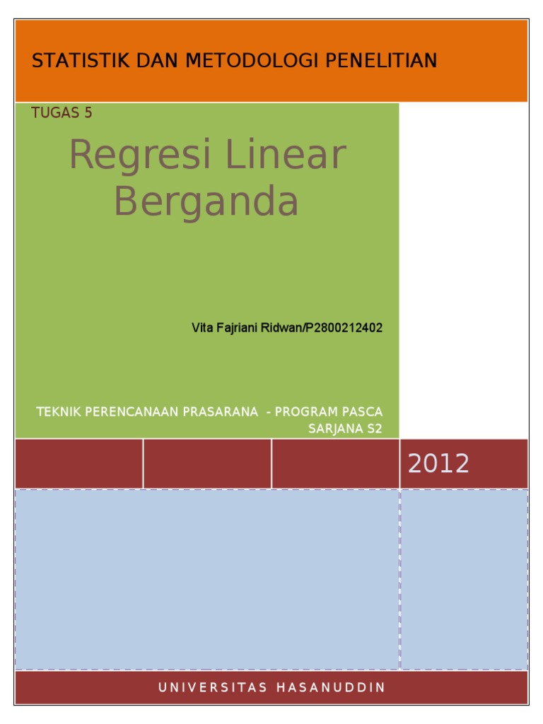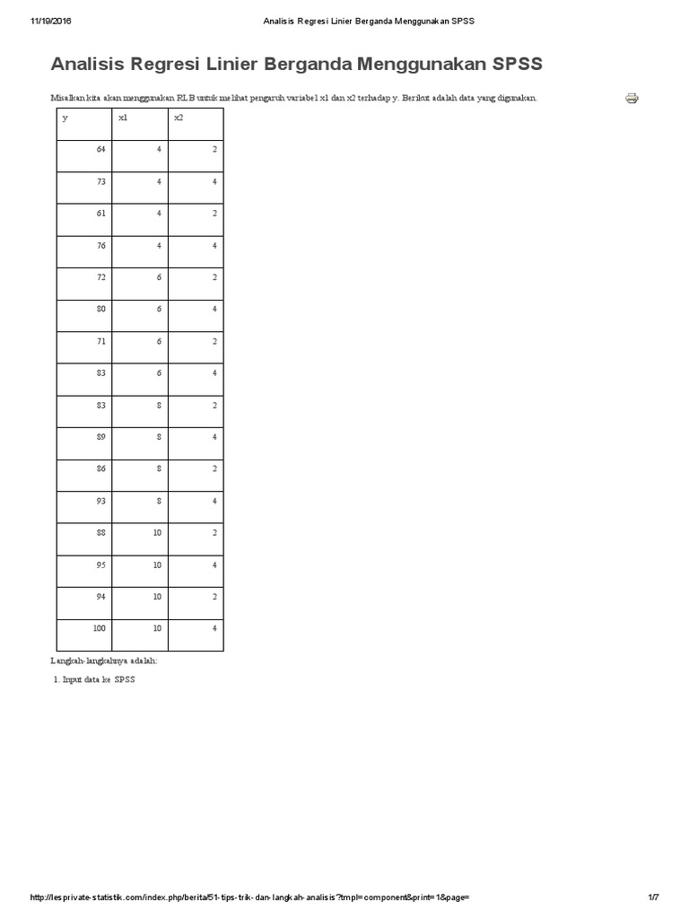 Dari uraian di atas maka didapat variabel dependen (y) adalah harga saham, sedangkan variabel independen (x1 dan x2) adalah per dan roi. Seorang manajer pemasaran deterjen merek. Dengan ini bambang menganalisis dengan bantuan program spss dengan alat analisis regresi linear berganda. Analisis regresi linear sederhana dengan menggunakan software minitab. Analisis regresi berganda 1 bab i pendahulian a. Syarat ini hanya berlaku untuk regresi linier berganda dengan variabel bebas lebih dari satu. Analisis regresi terdiri atas berbagai jenis, salah satunya adalah regresi linear berganda. Regresi ganda ialah suatu alat analisis peramalan niali pengaruh dua variabel bebas atau lebih terhadap variabel terikat untuk membuktikan ada atau tidaknya hubungan fungsi atau hubungan kausal antara dua variabel bebas atau lebih dengan satu variabel terikat. Dari hasil penelitian diperoleh data sebagai berikut Kegunaan analisis regresi linear berganda analisis regresi linear berganda digunakan untuk mengukur pengaruh antara lebih dari satu variabel prediktor y = variabel terikat a = konstanta b1,b2 = koefisien regresi x1, x2 = variabel bebas. Salah satu asumsi khusus untuk analisis regresi ganda adalah antar variabel independen korelasinya tidak boleh tinggi (asumsi multikolinearitas). 1.3 tujuan tujuan dari analisis regresi linear berganda, yaitu : Untuk membuat perkiraan nilai suatu variabel terikat jika nilai variabel bebas yang berhubungan dengannya sudah ditentukan 2.