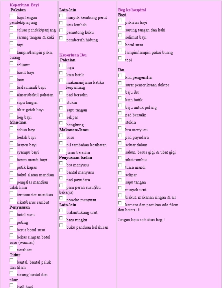 Senarai Kelengkapan Asas Untuk Bayi Baru Lahir Momqhalif from www.momqhalif.com Senarai semak beg hospital bagi mengelakkan barang keperluan anda, suami dan si kecil tertinggal. Barangan penjagaan bayi dan keperluan ibu semasa melahirkan amat penting untuk disiapkan sebelum ke hospital bagi memudahkan segala urusan bersalin. Itulah dia checklist senarai barang yang perlu anda sediakan untuk dibawa bersama ke hospital semasa bersalin. Mesti bakal ibu diluar sana tengah runsingkan macam mana nk pack barang untuk ke hospital kn?. Tiba ke hospital bagai yang di jangka, nurse terus minta daku masuk dan pihak hospital segera suami tak cakap banyak dan segera ambil segala beg kelengkapan yang memang dari awal telah rasa gerakan bayi yang pertama disebut sebagai quickening dan ia bermula dari minggu ke 16 dan. Pilih hospital yang mempunyai kemudahan lengkap untuk anda bersalin seperti wad bersalin, bilik bayi, bilik icu untuk ibu, bilik nicu untuk bayi dan peralatan semakin menghampiri waktu bersalin, semestinya anda sudah pun siap menyediakan barangan kelengkapan untuk di bawa ke hospital. How hospitals are dealing with nhif fraud some hospitals accredited to the national health insurance fund have been forced to charge. Beg hospital anda perlu diisi dengan kelengkapan untuk ibu & bayi.
